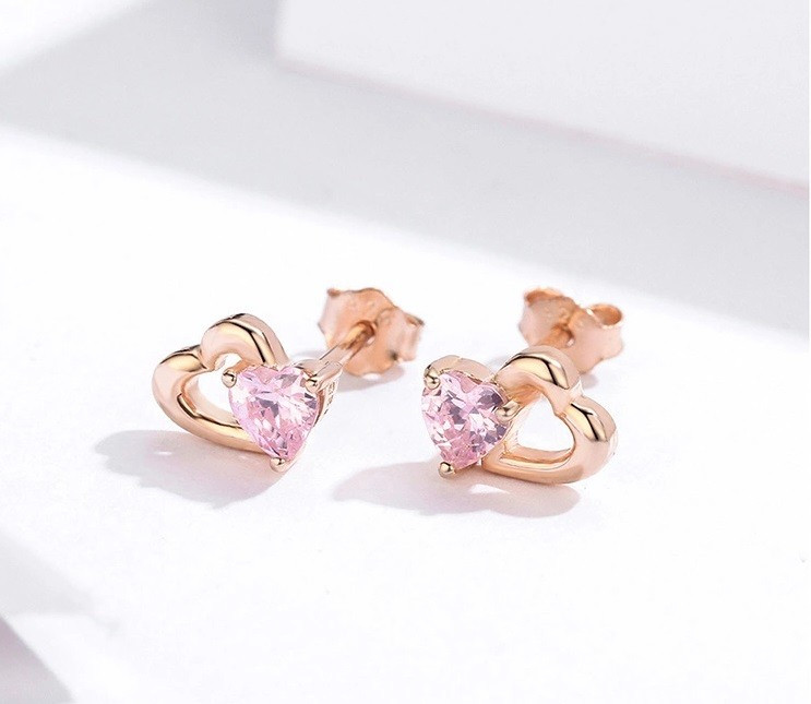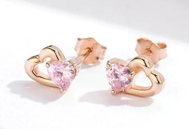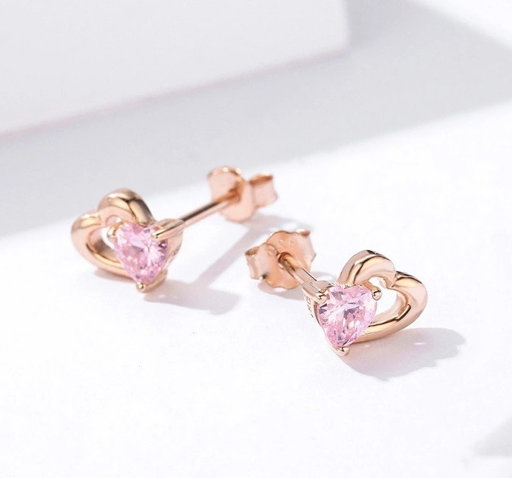 Die Basis der Ohrringe bildet hochwertiges 925 Sterling Silber. Für einen warmen und modernen Look wurde die Oberfläche poliert und mit einer hochwertigen Roségold-Beschichtung veredelt. Das Design zeigt zwei harmonisch verschlungene Herzen: Ein glänzend poliertes Herz in Roségold und ein zweites Herz, das durch einen funkelnden rosa Zirkonia alle Blicke auf sich zieht.