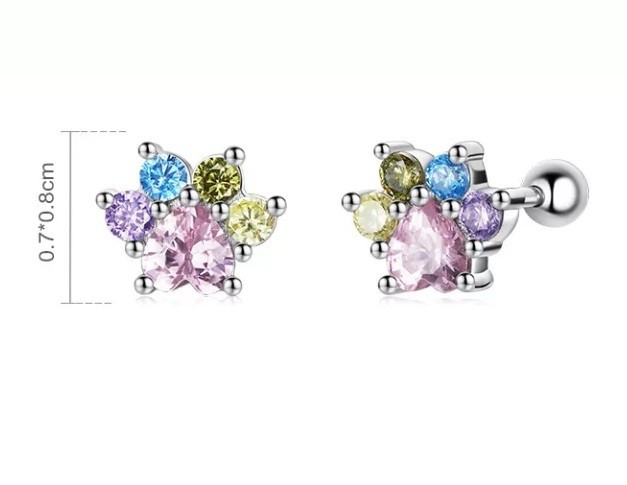 Die Ohrringe bestehen aus hochwertigem 925 Sterling Silber. Um den Glanz dauerhaft zu bewahren, ist die Oberfläche poliert und mit einer Rhodium-Beschichtung veredelt, die das Silber effektiv vor dem Anlaufen schützt. Das Herzstück der Pfote bildet ein großer Zirkonia in zartem Pink, umrahmt von vier weiteren Steinen in leuchtenden Farben wie Hellblau, Gelb, Grün und Violett.