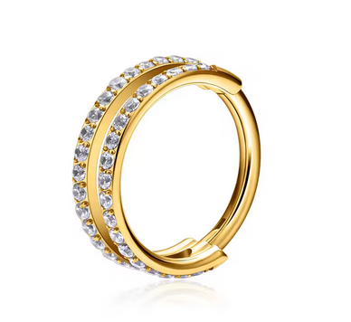 Hole dir den angesagten Layering-Look mit nur einem Piercing! Dieser raffinierte Doppelring kombiniert minimalistisches Design mit einem Hauch von Luxus. Die zwei parallelen Ringe erzeugen die optische Täuschung von zwei nebeneinanderliegenden Piercings, während die funkelnde Steinreihe für das gewisse Etwas sorgt.